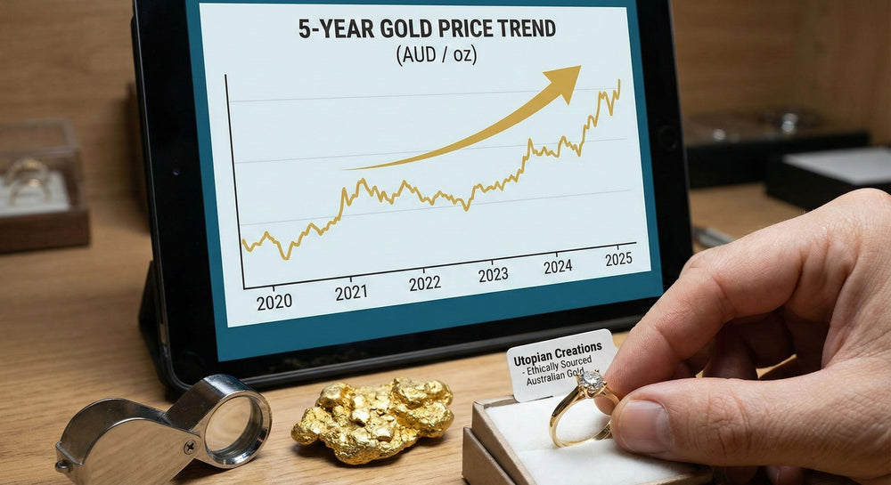 This comprehensive article, written by our jewellery experts at Utopian Creations, analyses the Gold price in Australia and its trend over the past five years (2020–2025), explaining the key global and local drivers—from the US Dollar to geopolitical uncertainty—and the compelling, long-term value of choosing ethically sourced Australian gold for your investment piece.
