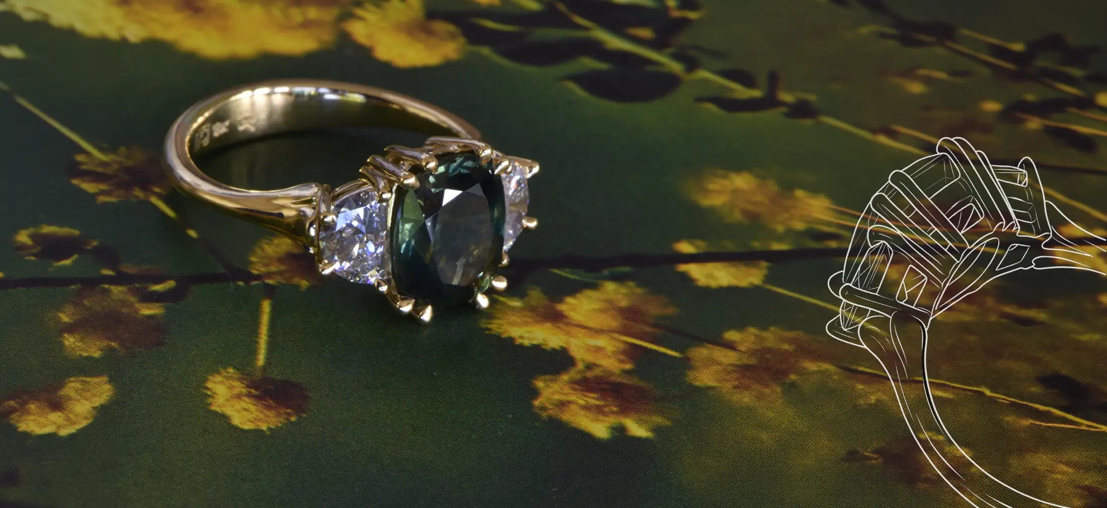 Three stones side by side: a centre stone flanked by two complementary stones, traditionally representing a relationship's past, present, and future. The side stones can match the centre or contrast it — different shapes, different colours, or a stone from an existing piece of meaningful jewellery.