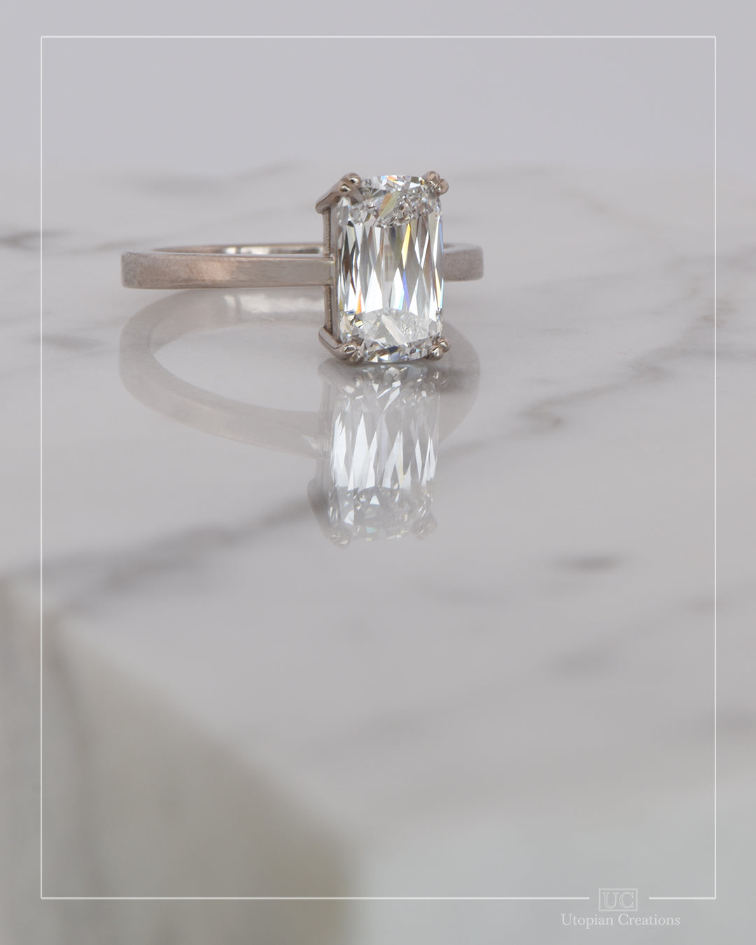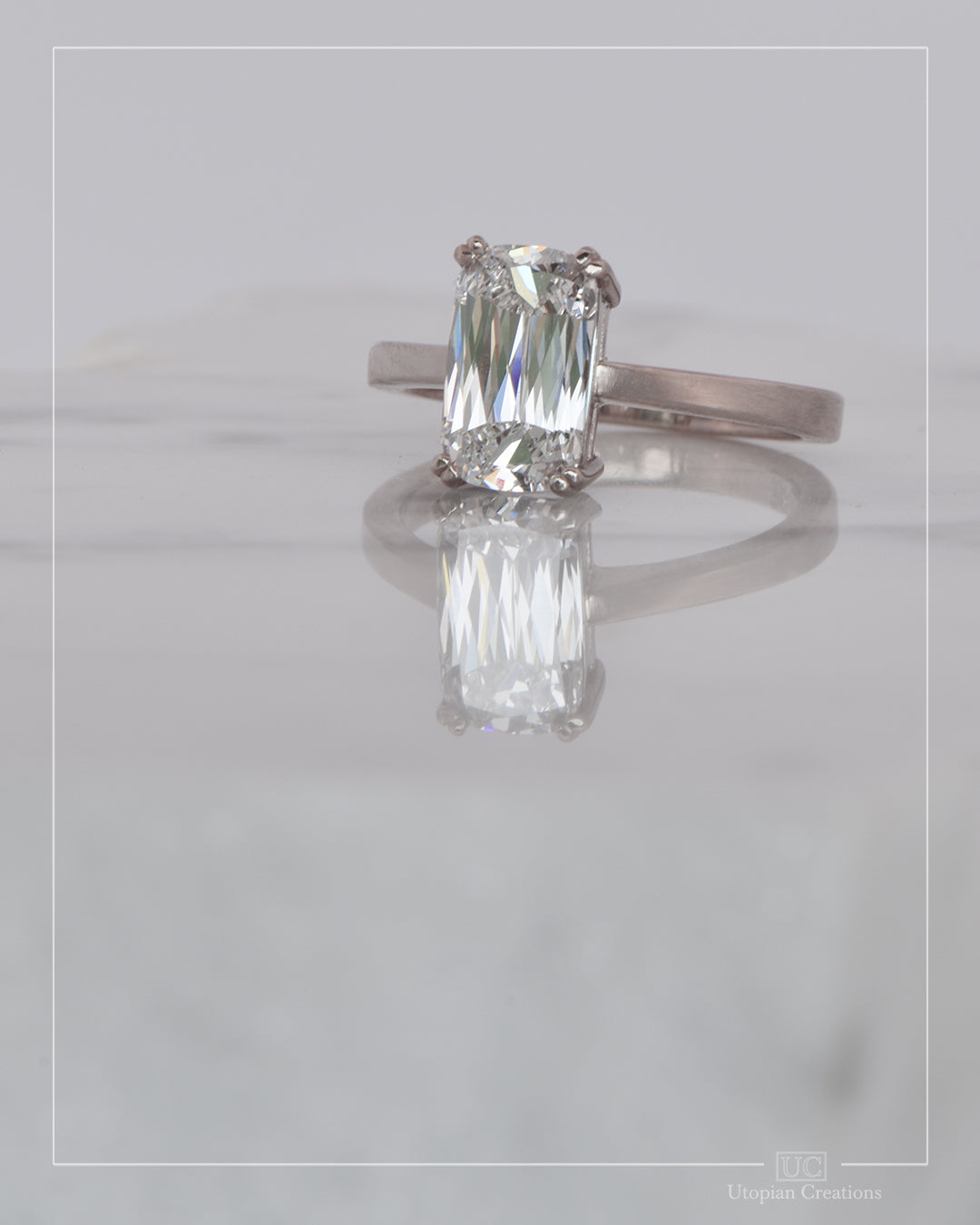Our Bridgeton ring showcases a mesmerizing 2.08ct cushion cut diamond in a striking modified shoulder solitaire design. Gazing into this diamond is akin to peering into an endless sea of brilliance; its sparkle is ceaseless, drawing you deeper with every look. We meticulously selected this diamond for its exceptional colour, clarity, and, most crucially, its cut. Such a high-quality diamond ensures maximum sparkle in any lighting condition, captivating onlookers and wearer alike.