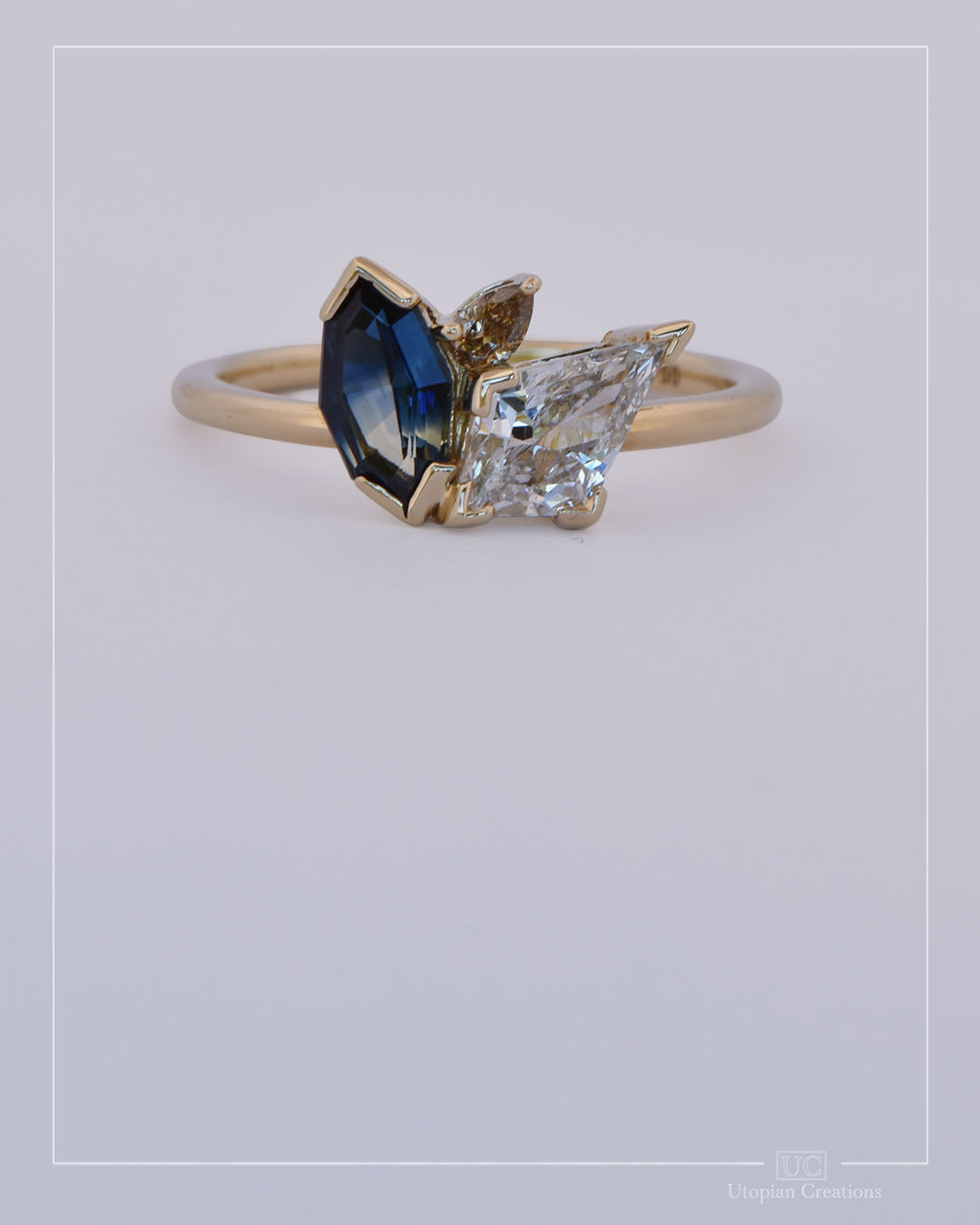 At its centre rests a striking lab-grown kite-cut diamond, its brilliance crisp and architectural, symbolising modern love and clarity of purpose. On one side glows a marquise-octagon Australian sapphire, untreated and naturally radiant, shifting in tone with the light — a reflection of Australia’s wild landscapes and the authenticity of nature. Completing the trio is a pear-cut Argyle champagne diamond, warm and delicate, its golden hue a subtle nod to one of the world’s most storied diamond origins.