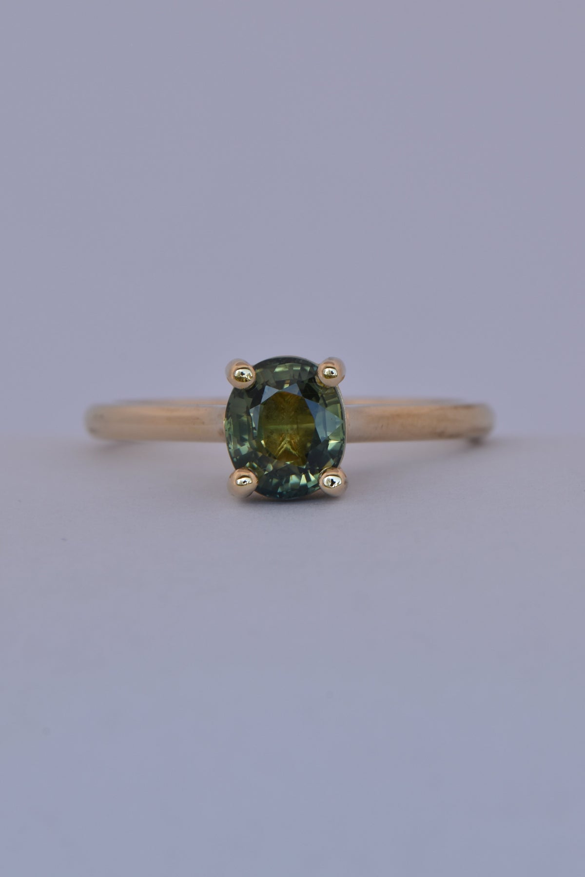 Meet Fern, a one-of-a-kind sapphire solitaire ring celebrating natural brilliance and conscious design. At its heart is a vibrant 1.56ct Australian parti sapphire, responsibly sourced from Rubyvale, Queensland. This unique oval-cut stone displays a vivid medley of green, yellow, blue, and teal, with colours that shift depending on the light — more blue in daylight, more green under artificial light.